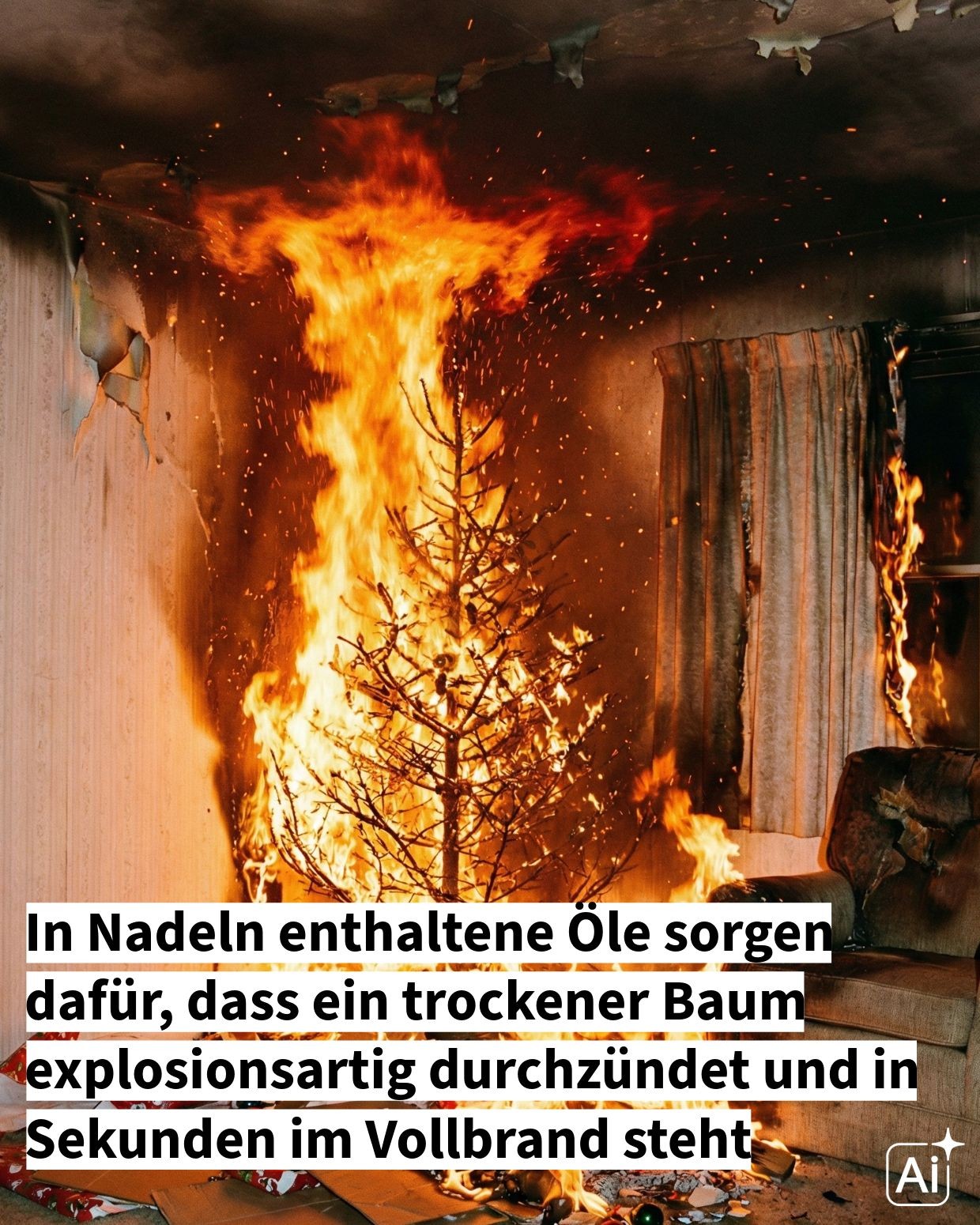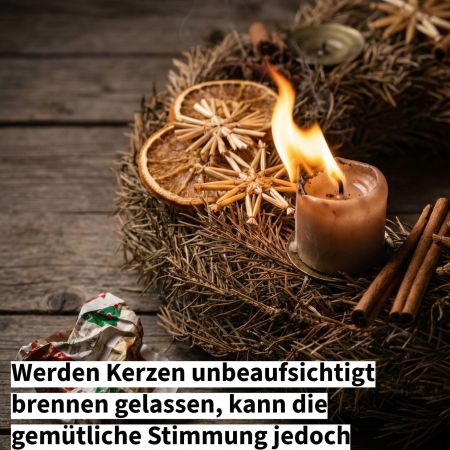 Der Kerzenschein gehört für viele von uns zur Weihnachtszeit einfach dazu, denn das warme Licht sorgt für Gemütlichkeit und Stimmung. Ein Adventskranz oder Weihnachtsbaum, der in einem warmen Zimmer steht, wird jedoch sehr schnell trocken. Und die trockenen Nadeln wirken, aufgrund der enthaltenen ätherischen Öle, wie Zunder. Ein kleiner Funke oder eine heruntergebrannte Kerze reichen oft schon aus, um das trockene Nadelholz explosionsartig zu entzünden. Ein solcher Brand entwickelt sich rasend schnell und setzt giftige Rauchgase frei. Um dies zu vermeiden, sollte man sicherstellen, dass die Bäume genügend Wasser erhalten und der sichere Umgang mit Kerzen bekannt ist: